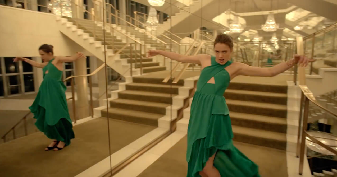 From here the Kenzo film kicks into high gear where Qualley seems to be possessed by a force as she dances erratically across the halls to the bass-heavy track “Mutant Brain” by Sam Spiegel and Ape Drums. The ubiquitous vocals by Jamaican dancehall artist Assassin enhances Qualley’s possession. She is seen punching, jumping, flying and shooting lasers across the halls unlike a typical perfume commercial. Ryan Heffington (who also choreographed Sia's "Chandelier" video) has orchestrated an uncanny mix of aggressive, goofy and elegant moves (don’t try this at home).
